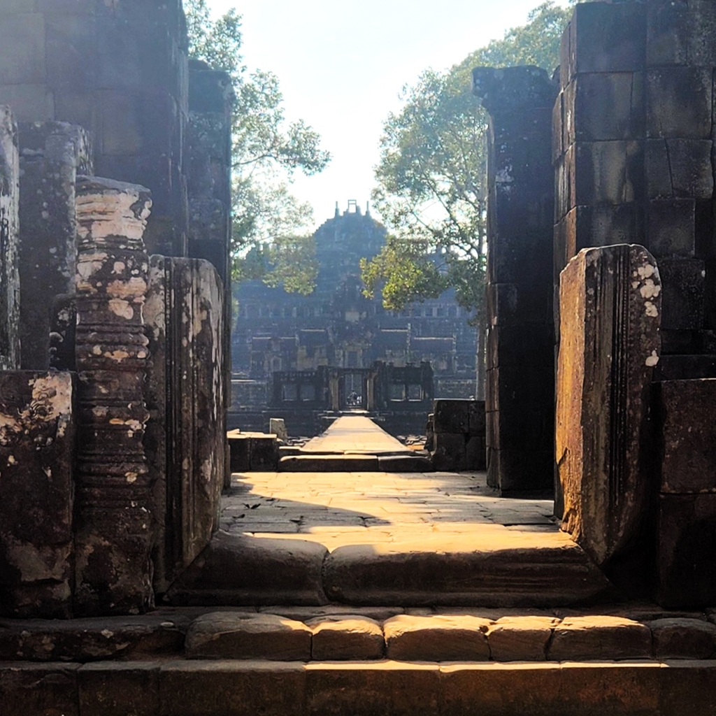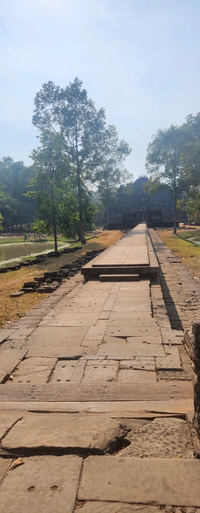 We entered Baphuon via a 200-meter-long sandstone causeway, gracefully elevated on sturdy pillars. The causeway, flanked by two elongated lakes mirroring its symmetry, stretched ahead like a timeless corridor through history. The pathway led us to an arched gateway that opened into the courtyard and, finally, the temple mountain itself.