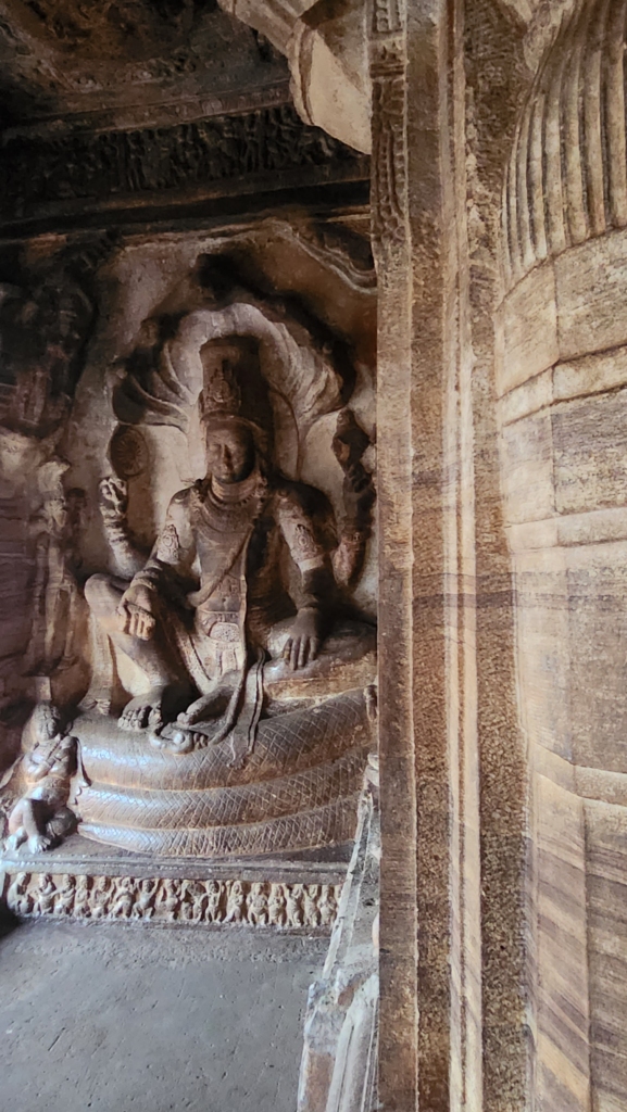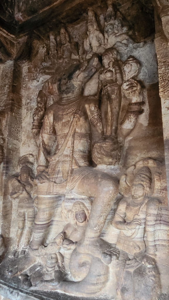 Now, onto the pièce de résistance – the third cave dedicated to Maha-Vishnu. The term Maha-Vishnu refers to the absolute truth. This cave is the largest and fanciest of the bunch, boasting sculptures of Vishnu sitting on Ananta (that’s a giant snake), plus the epic Varaha – Vishnu’s boar avatar! And jaw-dropping narrative friezes and carvings – it’s like a blockbuster movie playing out on the walls!