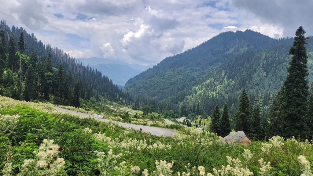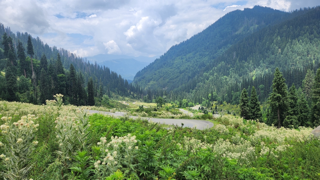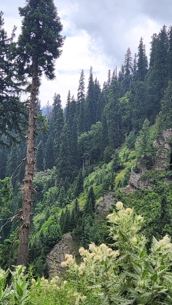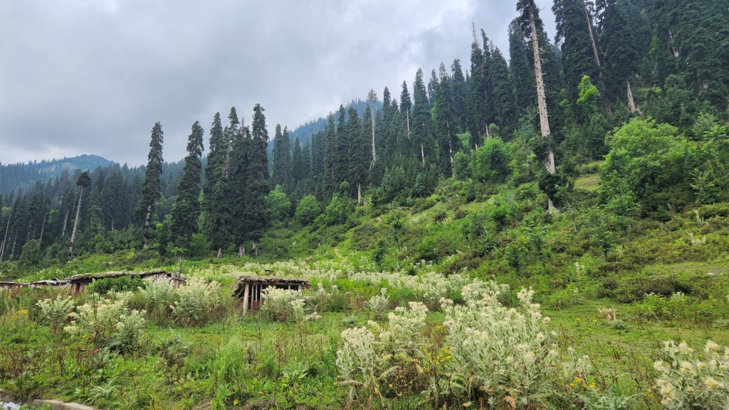 As we ascended, the route to Bangus Valley became increasingly scenic. The wildflowers lining the road provided a stunning backdrop for photographs. We passed through a small tribal village where the houses resembled those near Keran. These nomadic people move from place to place with their cattle and possess a wealth of knowledge about the flora and fauna. If we could communicate with them, we could learn a great deal. It’s intriguing to consider whether the population of these nomadic tribes is growing or declining and whether their descendants are inheriting forest trade secrets or migrating to cities for a different lifestyle.