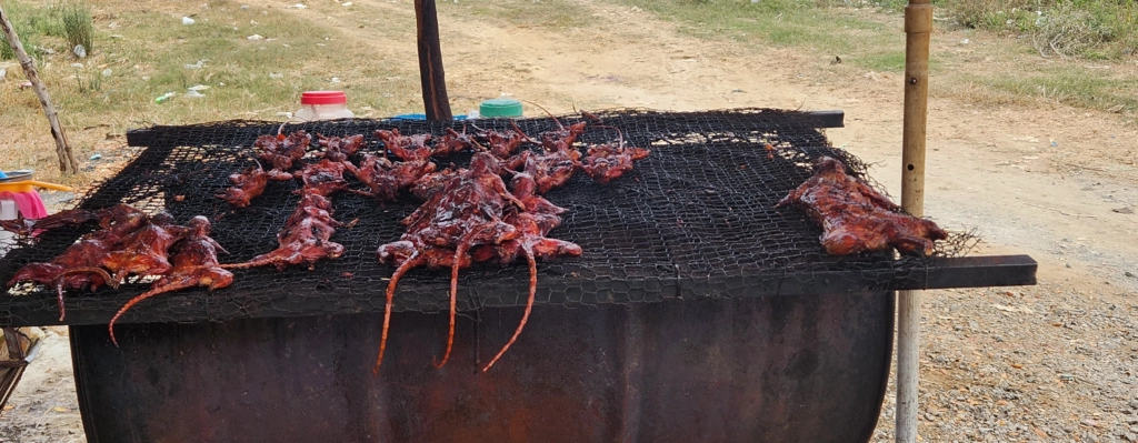 Somewhere mid-journey, Sieng casually dropped a nugget of local trivia that caught me off guard. “This area is famous for eating a certain kind of rat”, he said, as if it were the most natural thing in the world. Apparently, this was the only region in Cambodia where people dined on these rodents, and as proof, we soon spotted roadside stalls displaying roasted rats—each one splayed out in a dramatic Batman-like stance, crisped to perfection.
