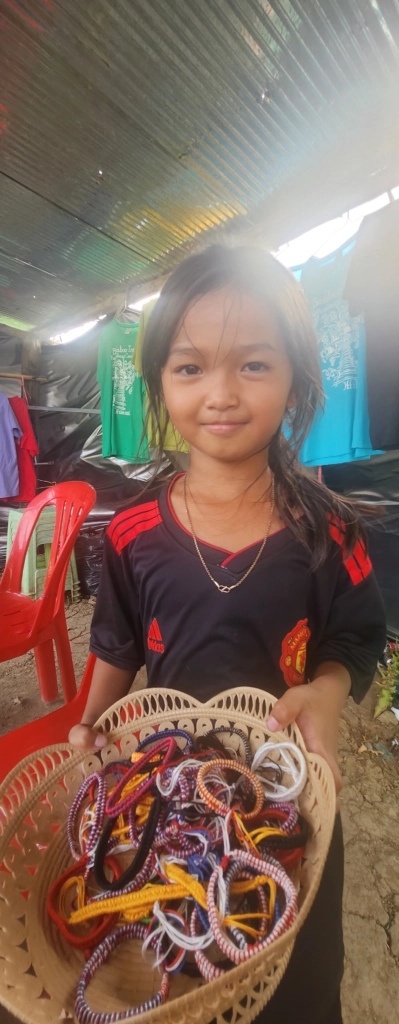 At the end of the track, we pulled into a small rest stop—a makeshift shack where a few vendors sold cold drinks and snacks. A group of British tourists were gearing up for their return ride, chatting excitedly about the experience. While Sieng and I sipped on fresh coconut water, a little local village girl approached me, holding up a handful of colourful woven wristbands for sale.