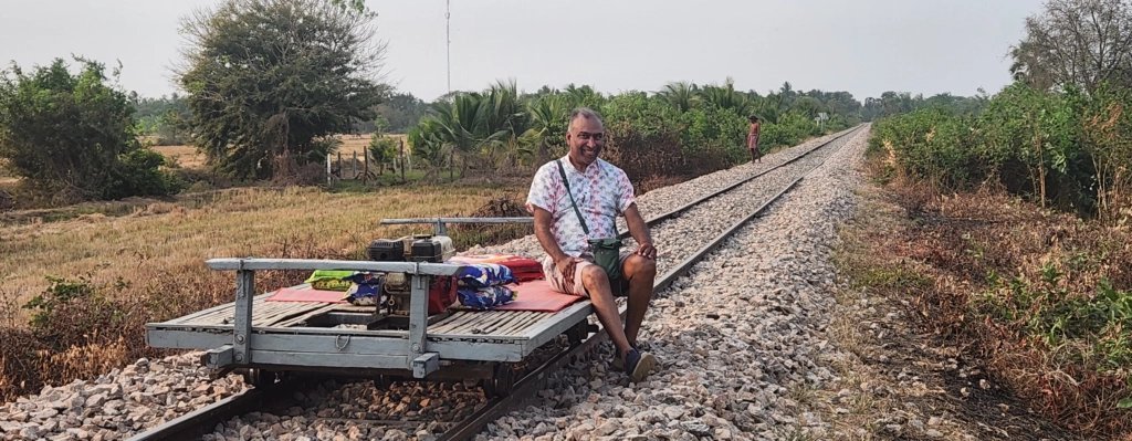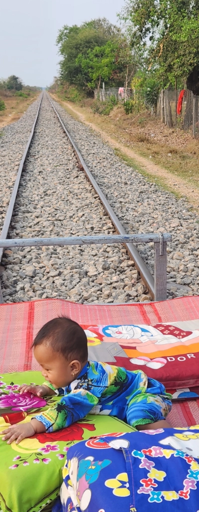 Now, calling it a “train” is a bit of a stretch. This wasn’t your typical locomotive experience. Instead, we had a “norry”—a flat bamboo platform resting on four metal wheels, powered by what looked like a small genset engine. No seat belts, no handrails, no safety warnings—just a thin mat spread across the surface with a couple of cushions tossed in for good measure. The setup was simple: climb on, fire up the engine, and let the wind (and a little bit of adrenaline) take over.