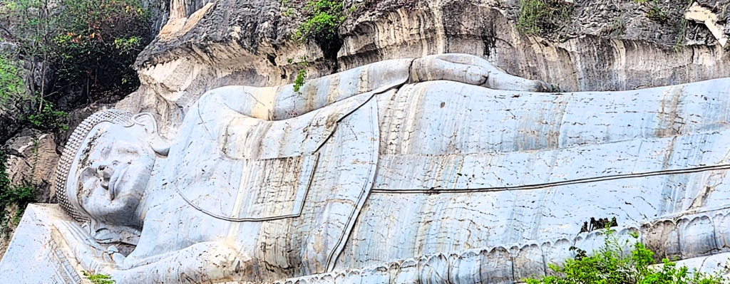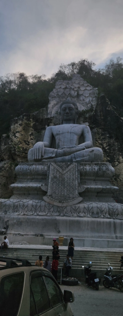 Just beside it, a large sleeping Buddha, intricately carved into the rock, watched over the scene. It was a poetic contrast—the stillness of the sculpture against the restless energy about to burst forth from the cave.