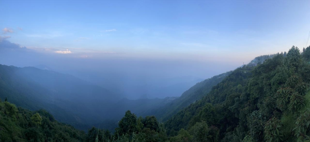 Post-lunch as we relaxed amidst the open expanse of nature, we sipped our tea while admiring the boundless valley below, where birds darted through the low-hanging clouds. Although we had given up hope of spotting Kanchenjunga due to overcast skies, we found solace in the simple joy of tea-drinking, a delightful indulgence supported by the favourable weather.