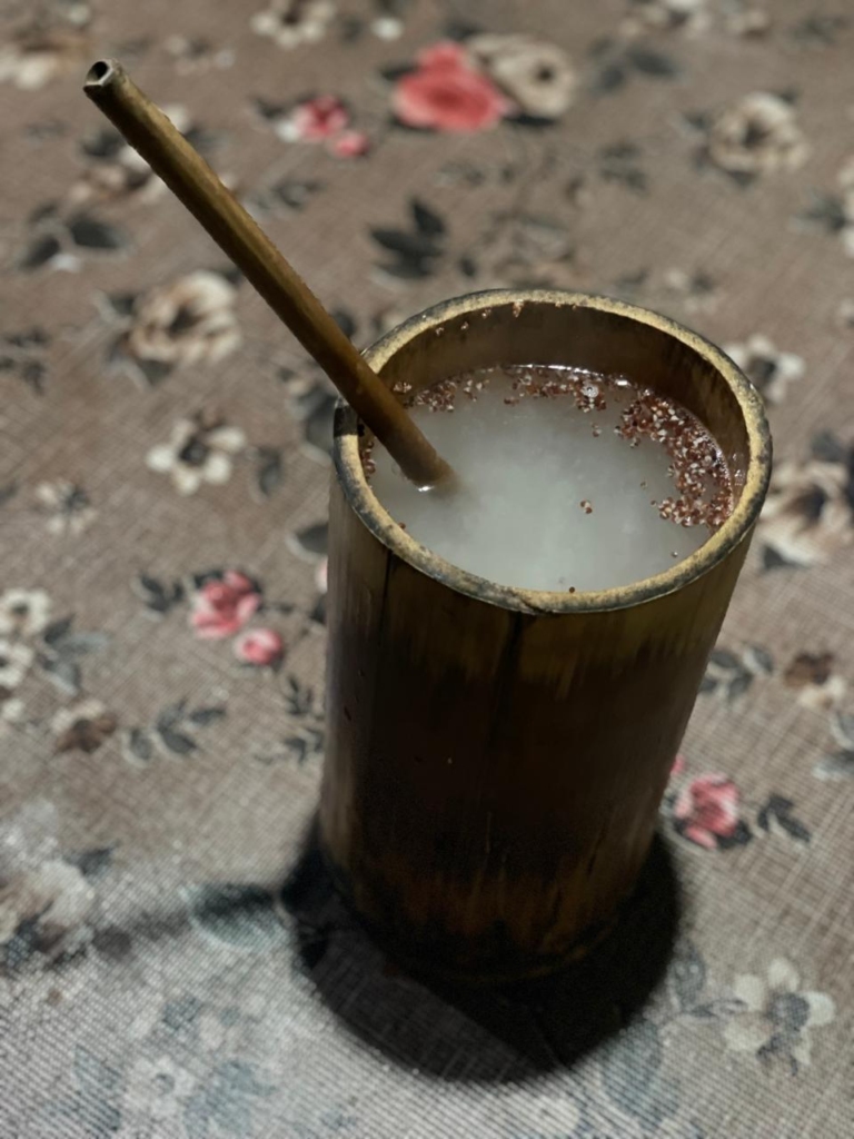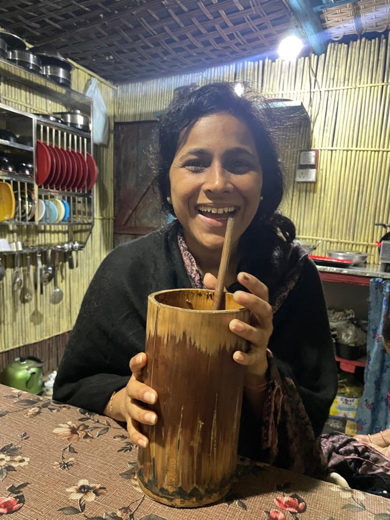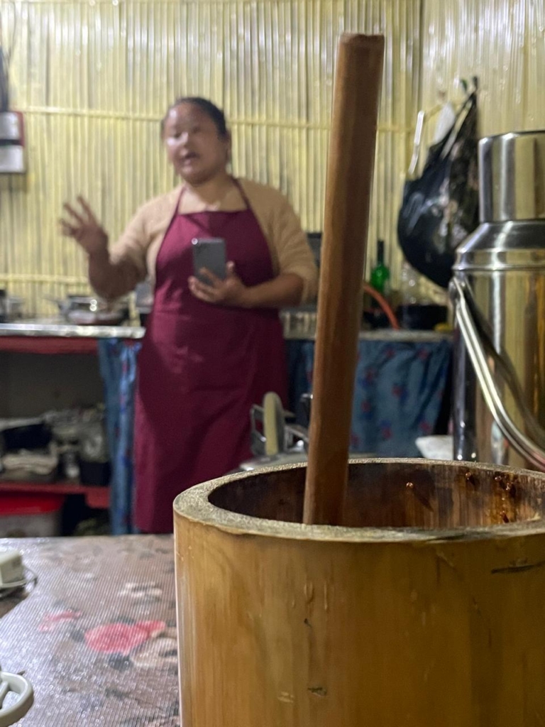 Nima graciously invited us into the kitchen where Tongba awaited us eagerly. He shared a brief history of this traditional millet-based alcoholic beverage, explaining that it was crafted from a millet variety called “kodo,” similar to the “ragi” millets found in the plains. The local variant of yeast is used to ferment cooked millet over a span of 3-4 days. Interestingly, “Tongba” actually refers to the bamboo vessel itself in which the drink is served – a long, vase-like bamboo container with a thick bamboo straw. Nima ensured we experienced Tongba in its most authentic form. The fermented millets settled at the vessel’s bottom, and Nima poured hot water over them, releasing both the flavour and intoxication into the milky-white concoction. He explained that the vessel could be refilled with water from the same millet stock up to three times until the alcohol content was exhausted, cautioning us not to disturb the settled millets at the bottom.