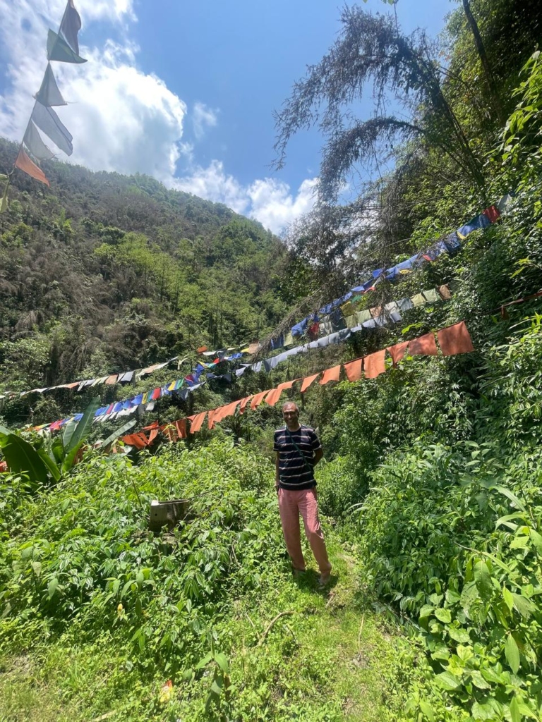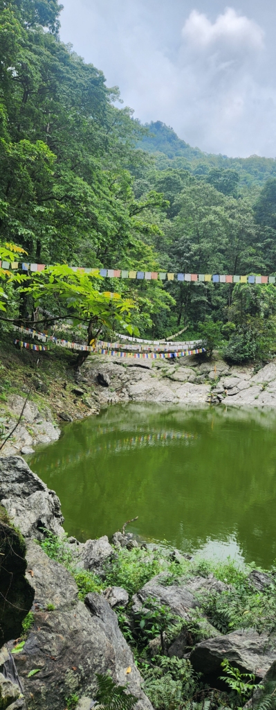 To our surprise, a young boy sat on the far side of the lake, absorbed in his notepad. Introducing himself as Kuncho, the forest officer for the Mangan zone, he was peacefully taking notes until our arrival piqued his curiosity. He shared fascinating local lore about Tingchim Tsho, the sacred wishing lake dating back seven generations. According to Kuncho, the lake’s guardian spirit, Jom Tshering, is revered by locals during Bhutia New Year for granting wishes and bringing inner peace. Though not New Year, we joined Kuncho in paying our respects to Jom, appreciating the lake’s serene ambiance and mystical significance.