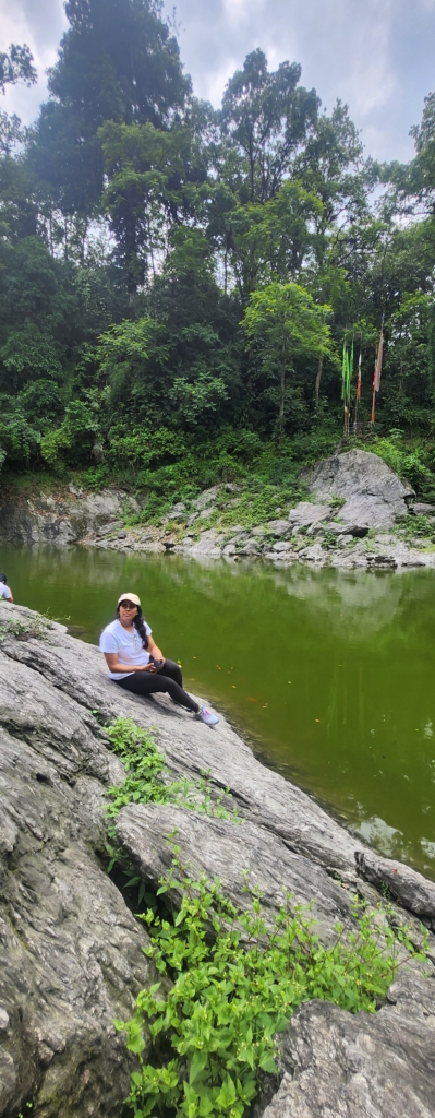 When we reached the end of the village road, we parked the car and set out on foot down a trail that led into the forest. Sikkim is known for its lush greenery, with over 70% of the state covered in forest, so stepping off the paved road often means stepping right into the woods. As we ventured deeper into the forest, we felt a bit uneasy, uncertain whether the lake we were seeking actually existed. We were relying solely on Rohit’s hearsay. Tazo confidently led the way through the forest. The forest was enchanting, its freshness invigorated by the melodious chirping of birds. MunMun was engrossed in identifying each flower by name, using her iPhone’s photo recognition feature, added a touch of curiosity to our journey. After a delightful ten-minute walk, we arrived at the lake, stunned by its hidden beauty. Few species of fish swam gracefully in its clear waters, captivating us with their tranquility.