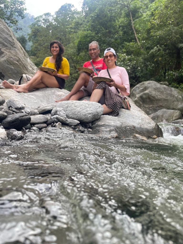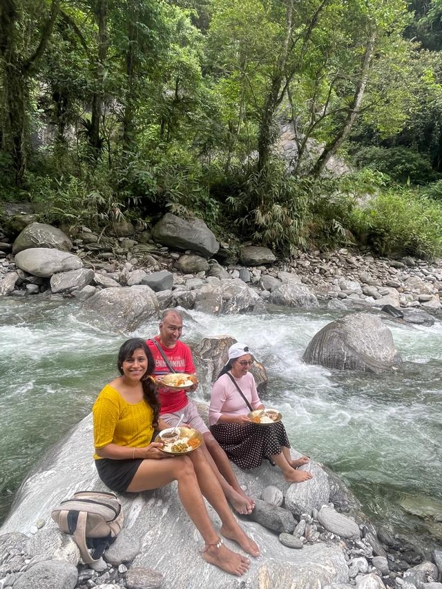The staff had prepared a delicious lunch for us, and their thoughtfulness extended to bringing brass plates, bowls, and spoons. They had taken care of every detail, ensuring everything was perfect. Tempted to dine quickly and leave MunMun sleeping behind, Tazo’s compassionate heart prevailed, and she woke her up. While a beer would have been ideal, we managed without one, opting to drink water straight from the river using the bowls. I’m certain we received a healthy dose of minerals along with it. We offered a round of applause and three cheers to the staff for their hard work, ensuring a truly memorable lunch session.