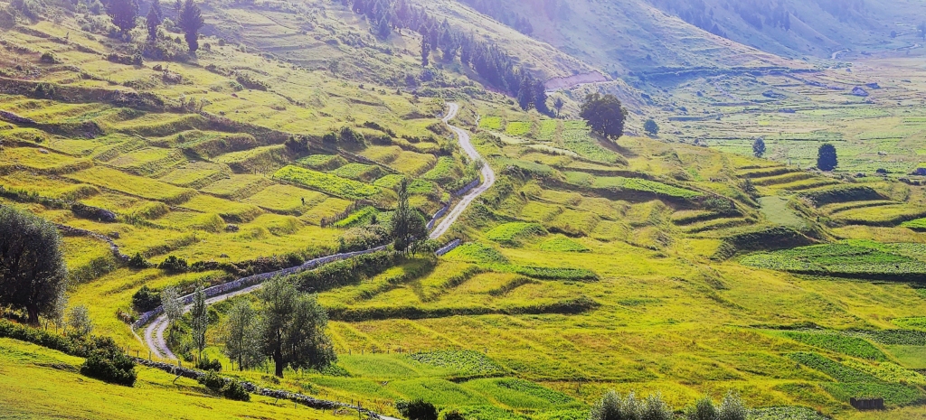 The meadows were alive with activity as cows contentedly muzzled the grass, and amidst this rural scene, a local farmer ferried soil in his colourful tractor. A young lady gracefully carried a bunch of dried woods from the forest to her home. The woods, neatly tied and held above her head, framed her as she descended the slopes with an air of elegance. She occasionally paused to wipe the sweat from her face, a small yet essential respite from the daunting task under the scorching sun. I pursued her with my camera, wishing to capture not only her labour but also the intricacies of her life – the size of her family, the dinner plans for the evening, and more. Amidst these simple yet significant activities, I revelled in the carefree moments of life. As we immersed ourselves in nature’s beauty, the local residents continued their daily lives.
