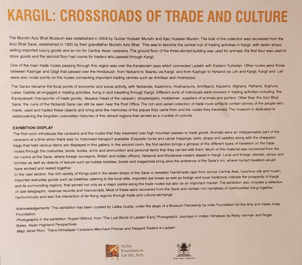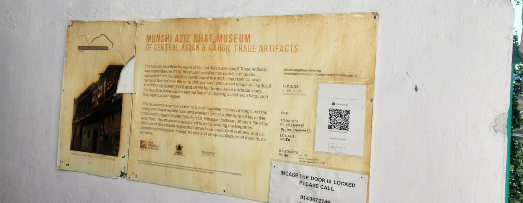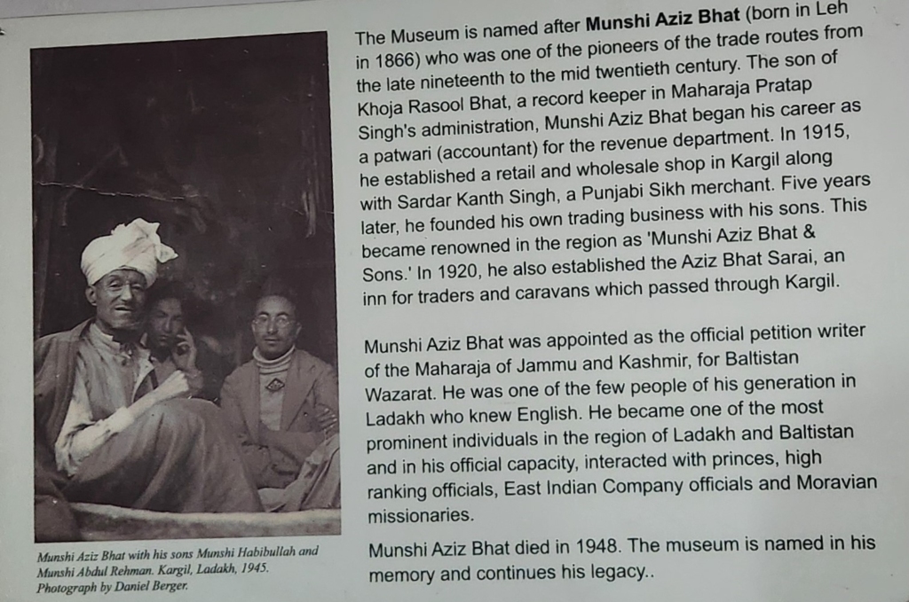 The local museum is named after Munshi Aziz Bhat, who was one of the most prominent individuals in the region of Ladakh and Baltistan having highly placed connections with kings / princes, East India Company officials and Moravian missionaries. He owned and operated several trading shops in Kargil and an inn – the “Aziz Bhat Sarai”, for traders and caravans which passed through Kargil.