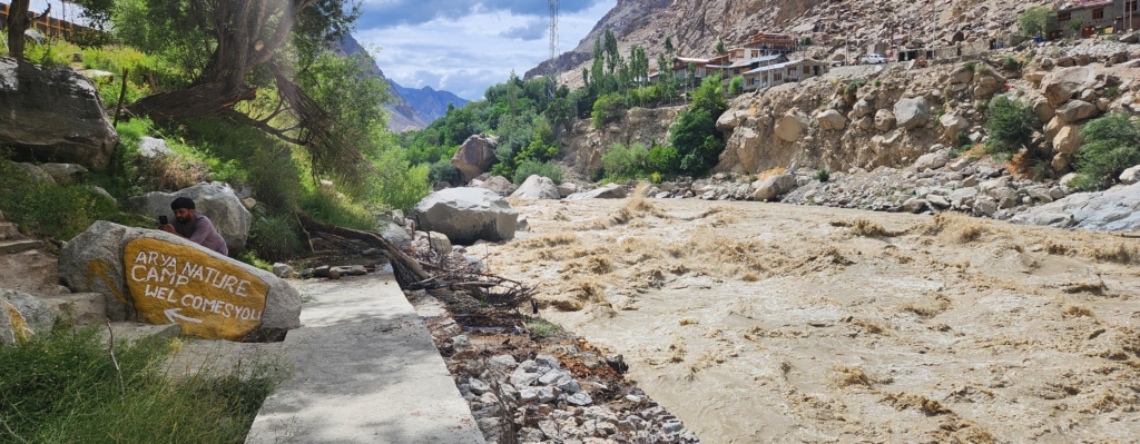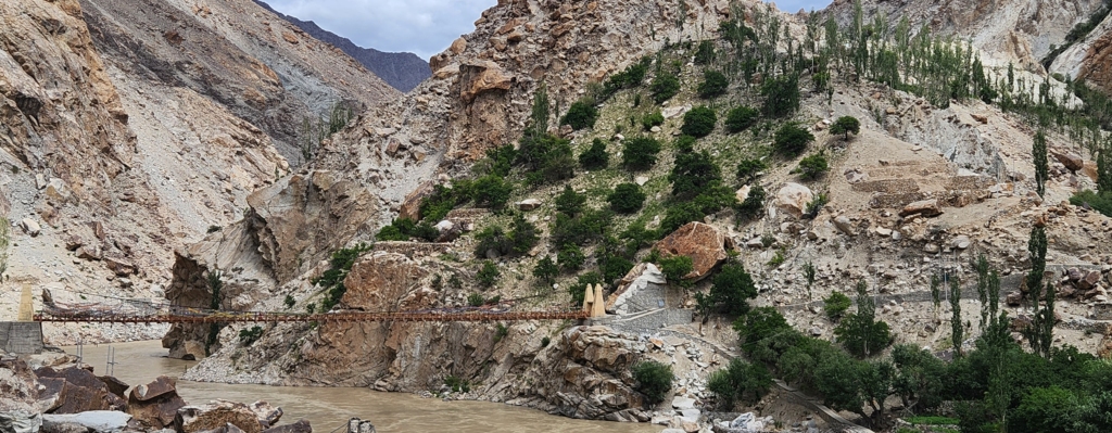 The flow of Indus was strong and created huge roar. The current is so strong, it can weaken the heart of even a gold-medal Olympian wrestler. Due to melting snow and monsoon season, the river was carrying heavy amount of silt, which had turned the colour of river water muddy brown.