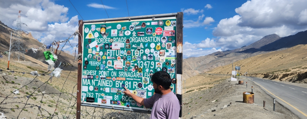 Actually, I have been sticking stickers of “HappyHorizon” and my social initiative “Aspire n Inspire” at several locations along the route. If you happen to be at any of these places, please click a photograph of our sticker and send it across to me. I would be really surprised if it’s still there surviving the extreme Ladakh weather, finger crossed. As we turned around to return back, an interesting road sign caught my attention.