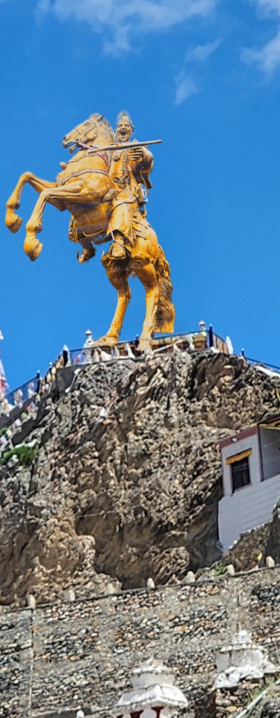 The drive led us to a small village called Wanla. It’s also called as Apple village. There is a small gompa on top of the mountain that crowns the village. As we looked around from the sidelines of the road, we saw a golden statue of a person riding on a horse-back installed atop the hill. The golden statue intrigued us to know more about the person. After interacting with the local villagers, we figured out that the statue was of Wanle Lhonpo – the wandering soul of Ladakh. He is remembered for his enigmatic personality and miraculous deeds. Based on Ladakh folklore, he also had miraculous power of communicating with deities.