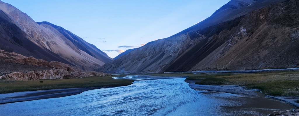 Arriving at the banks of Pangong Tso, we were greeted by an endless expanse of London Blue water that seemed to stretch into infinity. I’d heard from fellow travellers that the lake’s colours could shift dramatically – from azure to soft blue, green, and even grey – depending on the season and time of day. Its mesmerizing turquoise waters have captivated tourists for decades, especially since the film 3 Idiots showcased its stunning landscapes. Today, the evening light cast an indigo blue hue over the lake, blending seamlessly with the approaching dusk. It was a delightful conundrum – whether the sky was mirroring the lake or if the lake was echoing the sky; they seemed to mirror each other in a beautiful dance.