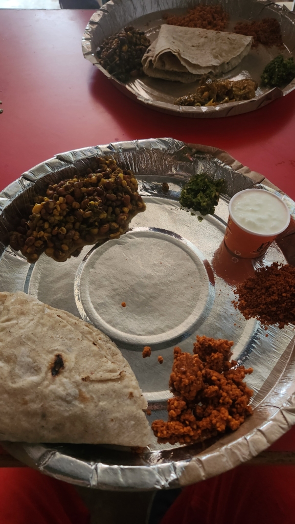 Once we arrived in Pattadakal, our stomachs were growling louder than a temple bell. Luckily, we stumbled upon a cozy roadside eatery that Ganesh insisted was our jackpot, and I wasn’t about to argue. It was run by the most delightful couple you could imagine. As you entered this place felt like home away from home. The lady was busy making fresh bhakaris right at the entrance, while her husband juggled everything else – taking orders, serving food with a smile, you name it. Their two kids added to the chaos, running around like little whirlwinds. The food was simple but oh-so-delicious, and I’m not sure if it was the grub or their warmth that made us eat like there was no tomorrow. When Ganesh asked for some ghee, the man brought out a whole bowl, enough to last us a lifetime!, leaving it on our table without a second thought. It was clear that for these folks, serving up good food was more important than anything else. Talk about hospitality with a capital H! We couldn’t thank them enough for their hospitality, so we decided to pay it forward by treating their kids to some sweets.