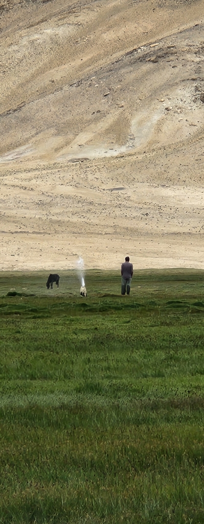 We made a spontaneous call to detour to Puga Hot Springs before pressing on to Karzok. I had expected a small pool-like setup here, similar to Panamik, but Puga had surprises waiting. The road meandered through lush green fields dotted with peacefully grazing cattle, the scenery painting a gentle contrast to the rugged hills in the distance. Soon enough, we began noticing chemical deposits sprinkled along the roadside – an earthy hint of the geothermal wonder we were approaching.