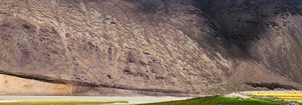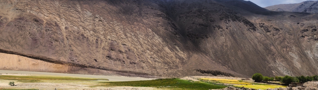 Stopping at a small dhaba to ask for directions, we were in luck – this was exactly the spot to set out toward the hot springs. Across a narrow stream lay an expansive grassland stretching to the foot of the barren mountains. The valley’s landscape, both stark and stunning, felt like a scene from another world. We found a shallow crossing in the icy stream, dipping our toes into the cold mountain water – a refreshing first for our Ladakh journey.