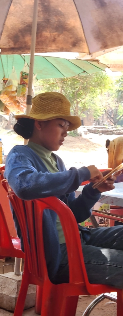 Back at the homestay, I met Kourn’s sister-in-law, a gentle and focused presence, as she crafted vibrant wristbands with threads and beads. We exchanged warm greetings, though her concentration on her art was unwavering.