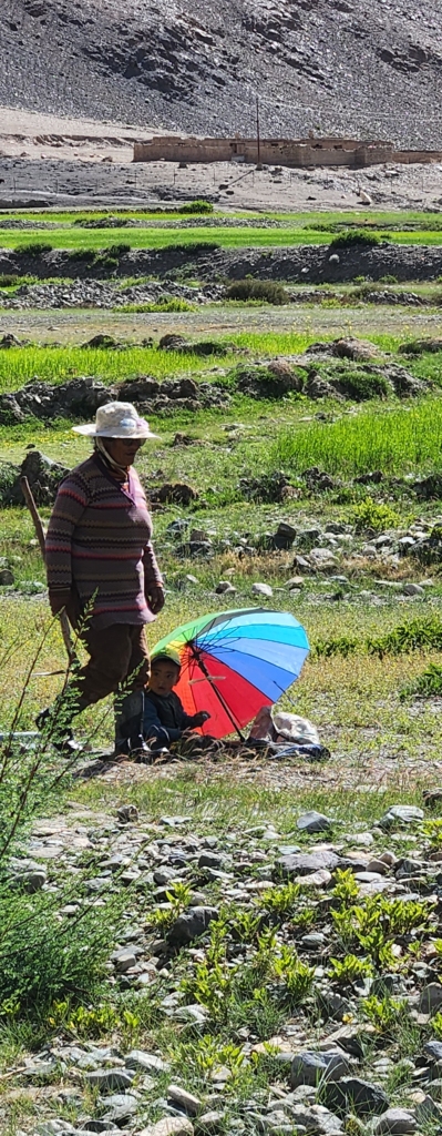 As we took diversion at Sumdo and drove towards Karzok a simple scene caught our attention – a local woman tending her field, with her young child seated patiently under the shade of an umbrella.