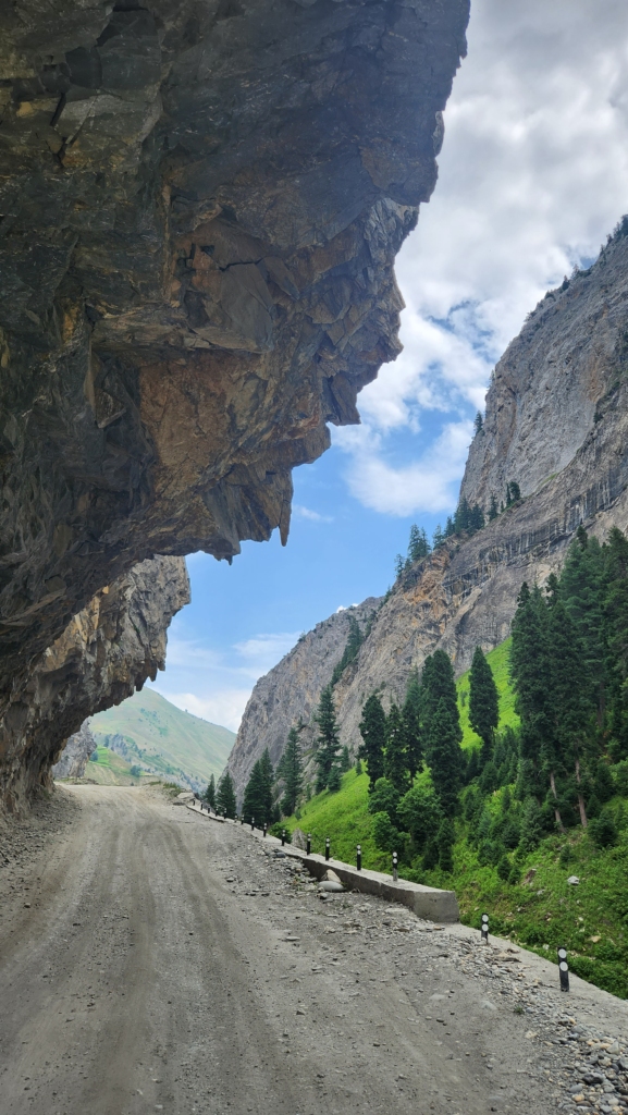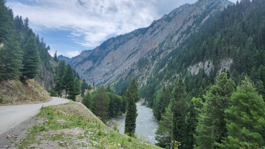 The initial part of the road is through between two mountains, very close to each other. The Kishanganga River accompanies the road throughout the journey. As the river is compact here, you can hear the water gushing down, the natural slope doing its work. After covering a small distance, the tar road gives way to a dirt track.