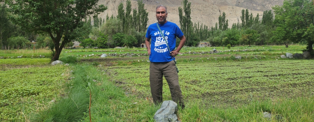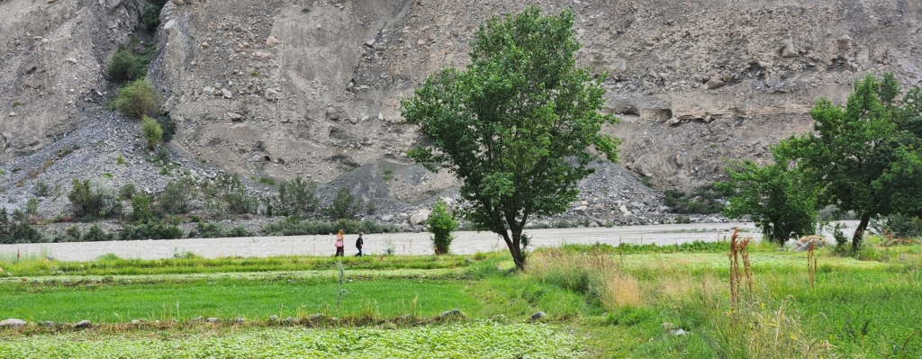 Post breakfast, we decided to explore the interiors of Tyakshi village. We found a short way to the banks of the Shyok river through the fields of the village. We walked carefully through the fields trying not to damage the paddy. We could see lush green paddy fields till the end of the village. There were few apricot trees on the sidelines.
