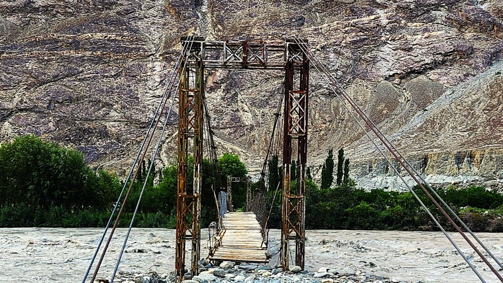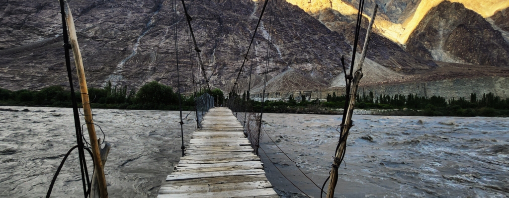 At first glance, the low, swaying bridge filled me with fear. The river’s thunderous roar only heightened the sense of foreboding. Its murky waters, heavy with sand and mud from the melting glacier, gave it a fearsome appearance. Yet, despite this, the surrounding landscape was nothing short of breathtaking, framed by the splendor of the atmosphere. After watching a few villagers cross with ease, I summoned the courage to step onto the bridge myself.