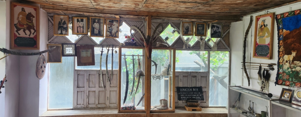Ascending from the courtyard, we entered the museum, which houses a fascinating collection of bows and arrows, maps, shields, lapis lazuli-encrusted swords, portraits, paintings, family record books, clothing, footwear, headgear, and even stuffed hunted animals. These dusty artefacts are the only remnants of Baltistan’s royal legacy. Much like the entrance gate, the museum features a large stuffed eagle, likely an emblem of the Yabgo dynasty.